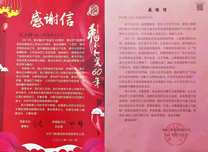 近日,公司接连收到两封感谢信,写信单位分别是湖南云箭集团有限公司和北京飞航捷讯物资有限责任公司.