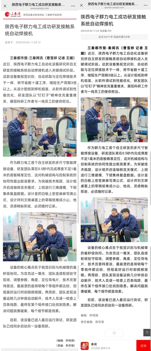 近日,题为《陕西电子群力电工成功研发接触系统自动焊接机》的新闻报道被三秦网和秦闻刊发。