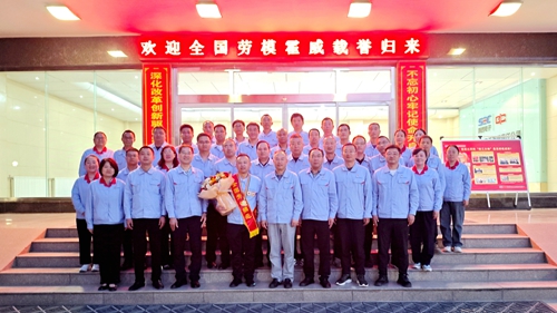 4月29日下午,办公楼前锣鼓喧天,公司领导班子一行热情迎接荣获2025年“全国劳动模范”称号的公司首席技能专家霍威载誉归来